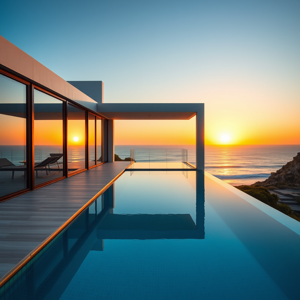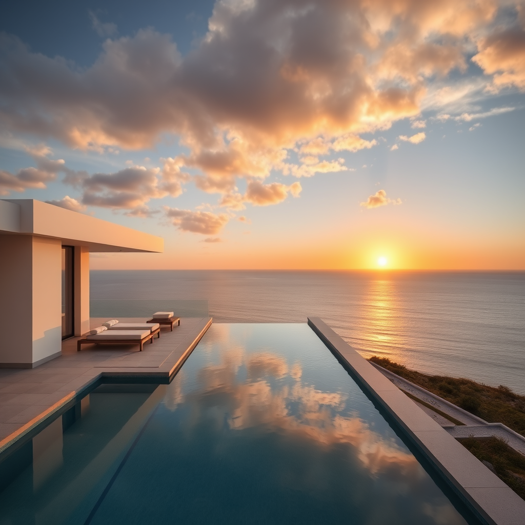 Swim while gazing at the endless sea. Heated saltwater pool merges with the horizon. Designer sun loungers and poolside bar complete the experience.